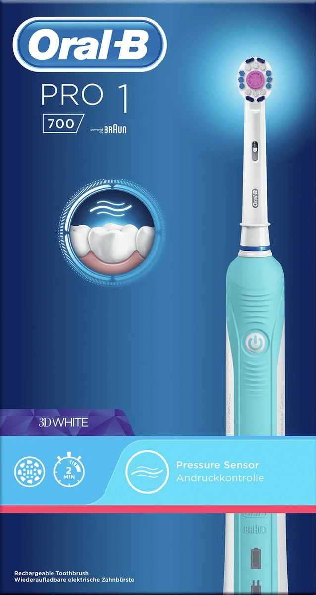 De Pro 1 elektrische tandenborstel helpt u 2 minuten te poetsen met de professionele timer, zoals de tandarts dat aanbeveelt, en hij meldt u om de 30 seconden dat u een ander gebied moet poetsen. U beweegt de borstel gewoon in uw mond en de unieke, ronde kop van Oral-B doet de rest. Hij verwijdert tot 100% meer tandplak dan een gewone manuele tandenborstel voor gezonder tandvlees en maakt uw glimlach witter vanaf de eerste poetsdag door oppervlakkige verkleuringen te verwijderen. De Oral-B Pro 1 met professionele timer is een geweldige tandenborstel voor iedereen die naar een elektrische tandenborstel wil overschakelen. Geen wonder dat Oral-B het meest aanbevolen merk door tandartsen wereldwijd is.
